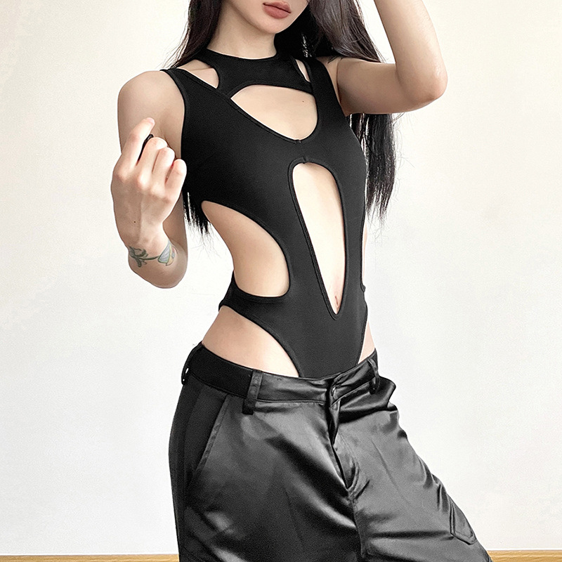 Oblique Shoulder Collar Metal Ribbon Nail Decoration Slim-fit T-shirt